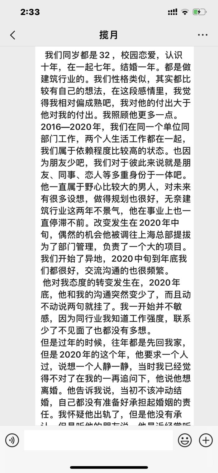 他一直属于野心比较大的男人,对未来有很多设想,做得规划也很好,无奈建筑行业这两年不景气,他在事业上也一直停滞不前。改变发生在2020年中旬,偶然的机会他被调往上海总部提拔为了部门管理,负责了一个大的项目。我们开始了异地,2020中旬到年底我们都很好,交流沟通的也很频繁。