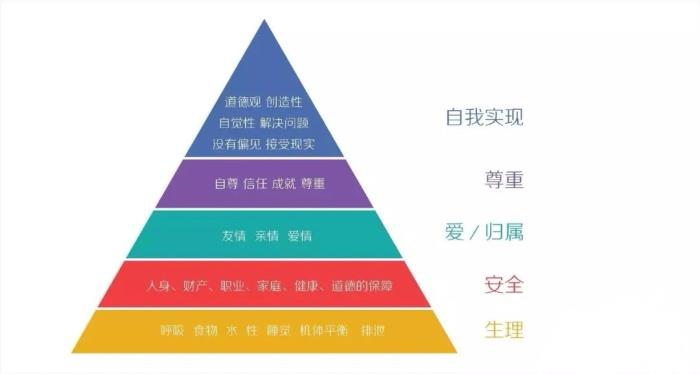 美国心理学家亚伯拉罕·马斯洛在1943年在《人类激励理论》论文中,将人类需求像阶梯一样从低到高按层次分为五种,分别是:生理需求、安全需求、爱和归属需求、尊重需求和自我实现需求。
