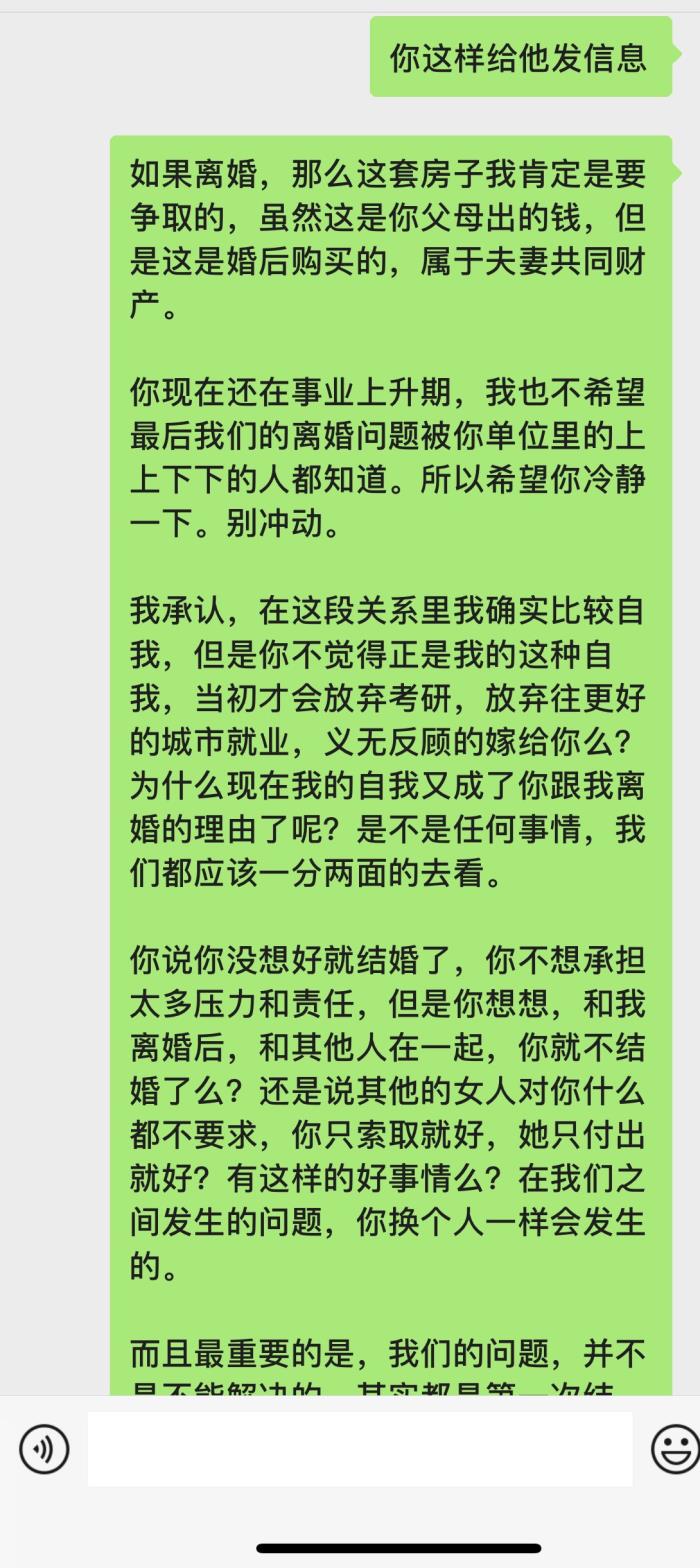你现在还在事业上升期,我也不希望最后我们的离婚问题被你单位里的上上下下的人都知道。所以希望你冷静一下。别冲动。