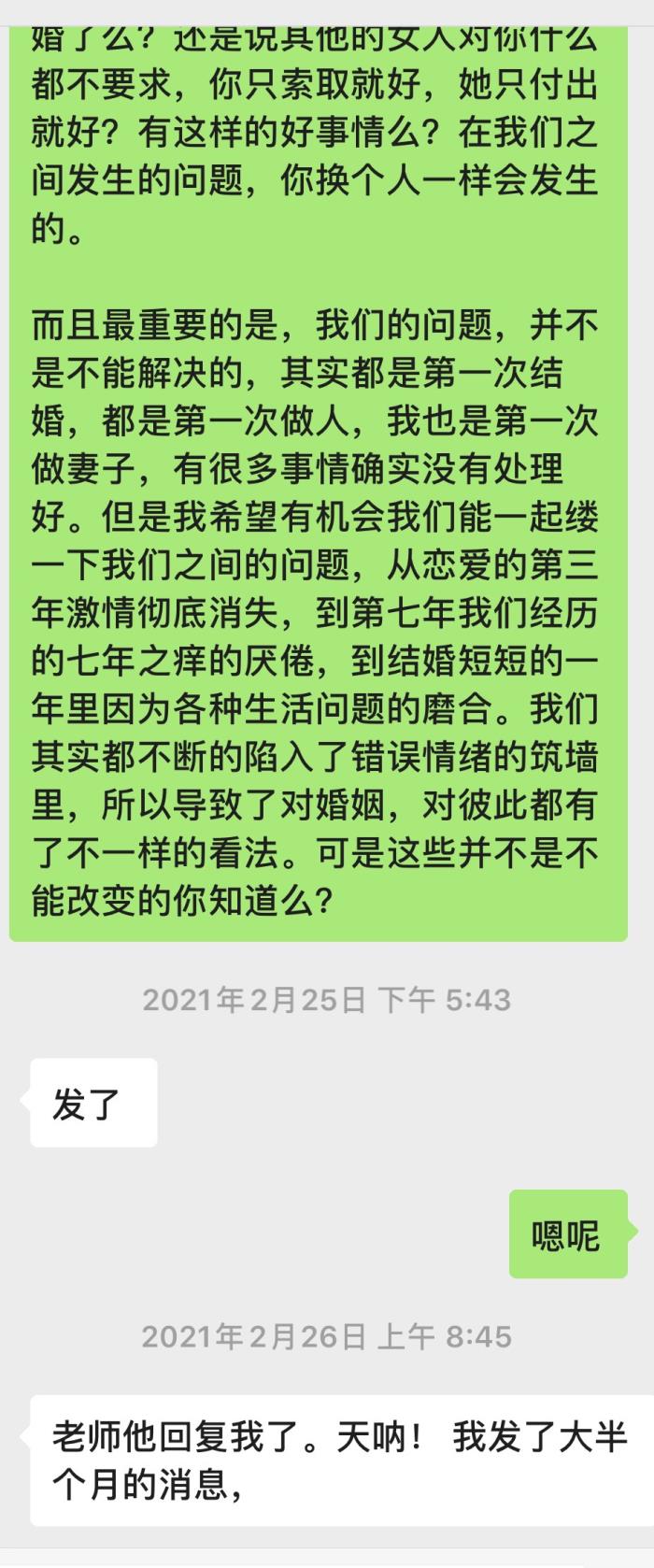 而且最重要的是,我们的问题,并不是不能解决的,其实都是第一次结婚,都是第一次做人,我也是第一次做妻子,有很多事情确实没有处理好。但是我希望有机会我们能一起缕一下我们之间的问题,从恋爱的第三年激情彻底消失,到第七年我们经历的七年之痒的厌倦,到结婚短短的一年里因为各种生活问题的磨合。我们其实都不断地陷入了错误情绪的筑墙里,所以导致了对婚姻,对彼此都有了不一样的看法。可是这些并不是不能改变的你知道么?