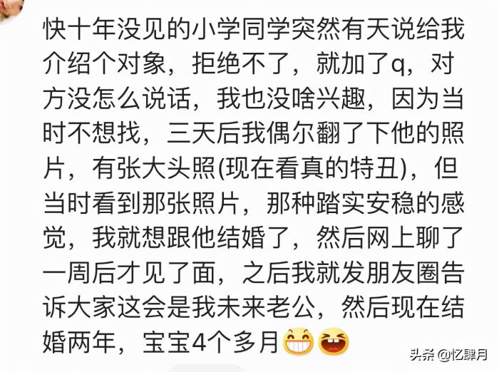 网友1:刚找的新工作,和新同事也没怎么说话,突然有个女生和我开玩笑,这么郁闷,失恋啦,没关系,姐给你当媳妇,就这么在一起了,结婚七年咯