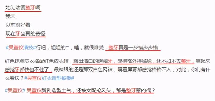 从那次之后大家就开始吐槽吴宣仪整的牙,有人说整牙如整容,吴宣仪怎么越整越难看了?还有人说她是一步错步步错,现在的牙齿不管搭配什么造型,都显得格外的土气,尤其是笑起来的时候,真想把她的嘴缝上。