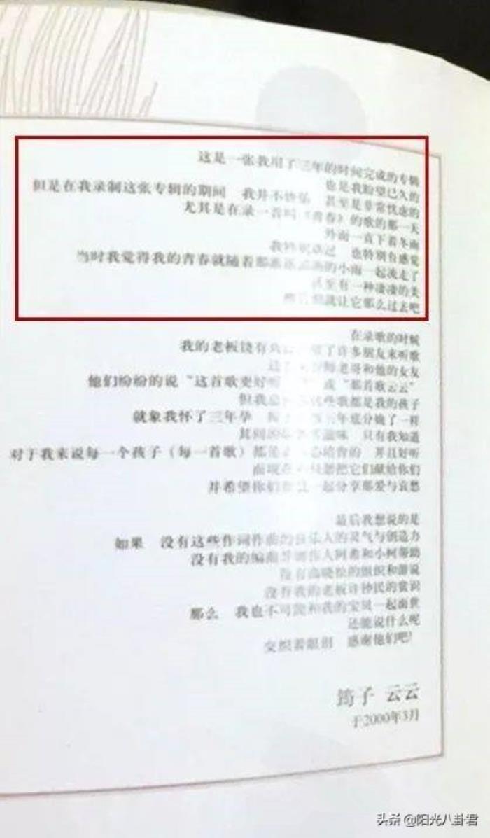 “在我录制这张专辑的期间,我并不快乐,甚至是非常忧虑的。尤其是在录一首叫《青春》的歌的那一天,外面一直下着冬雨,我特别难过,也特别有感觉。当时我觉得我的青春就随着那淅淅沥沥的小雨一起流走了,然后想,就让它那么过去吧。”