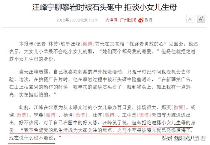 但汪峰也拒绝公开透露女儿生母的身份:“我不希望我的私生活成为大家关注的焦点,之前小苹果被曝光我已经很后悔了,现在说什么也不能说。”