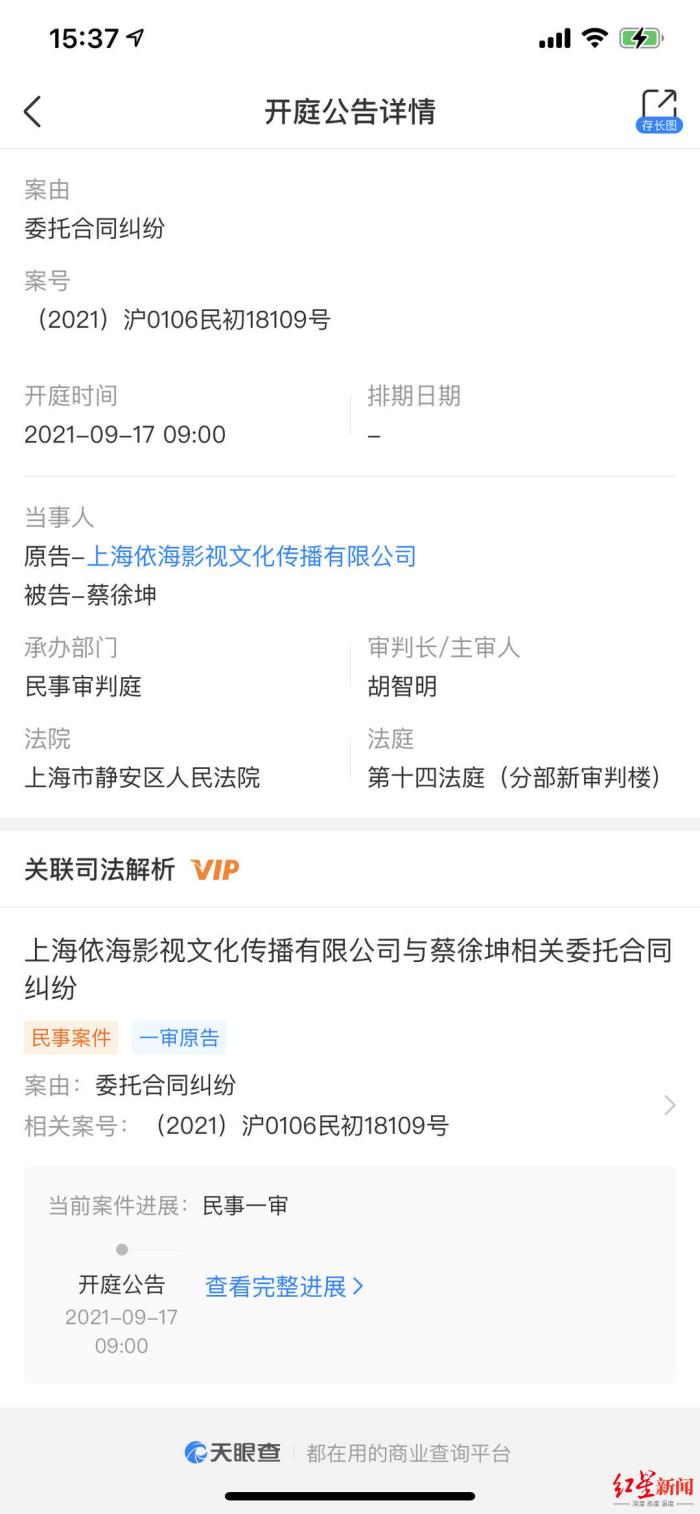 据天眼查APP显示,上海依海影视文化传播有限公司与蔡徐坤相关委托合同纠纷案将于9月17日开庭,审理法院为上海市静安区人民法院。