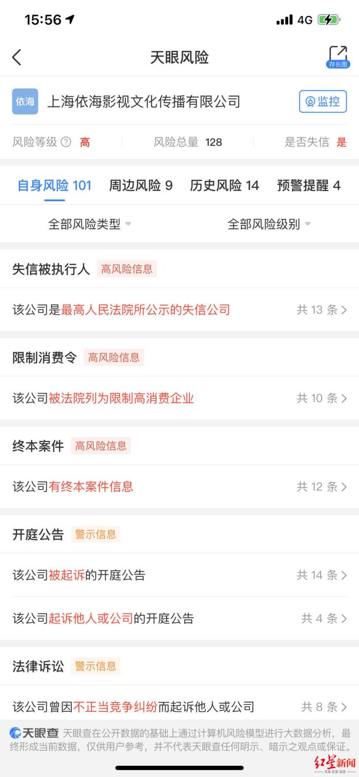 值得一提的是,据天眼查显示,上海依海影视文化传播有限公司是最高法院公示的失信公司,同时也被法院列为限制高消费企业。