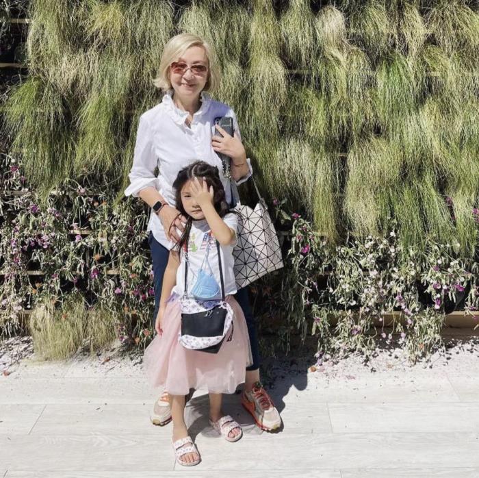 陈冠希的女儿和奶奶合影,Alaia梳着漂亮整洁的披肩发,白色T恤搭配粉色小纱裙,脖子上挂了好几个包包,十分可爱。大概是阳光太刺眼,也没给准备一副墨镜,Alaia用一只手遮挡自己的眼睛,热得笑不出来。