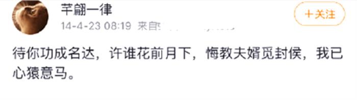 她发文:“待你功成名达,许谁花前月下,悔教夫婿觅封侯,我已心猿意马。”