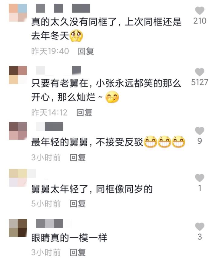 网友看了张晓龙晒出的视频,有人说真是久违的同框,上次看到两人合影还是去年冬天的事情。也有人夸舅舅太年轻了,和外甥女站在一起像同岁。也有网友发现两人长得很像,尤其是眼睛几乎一模一样。