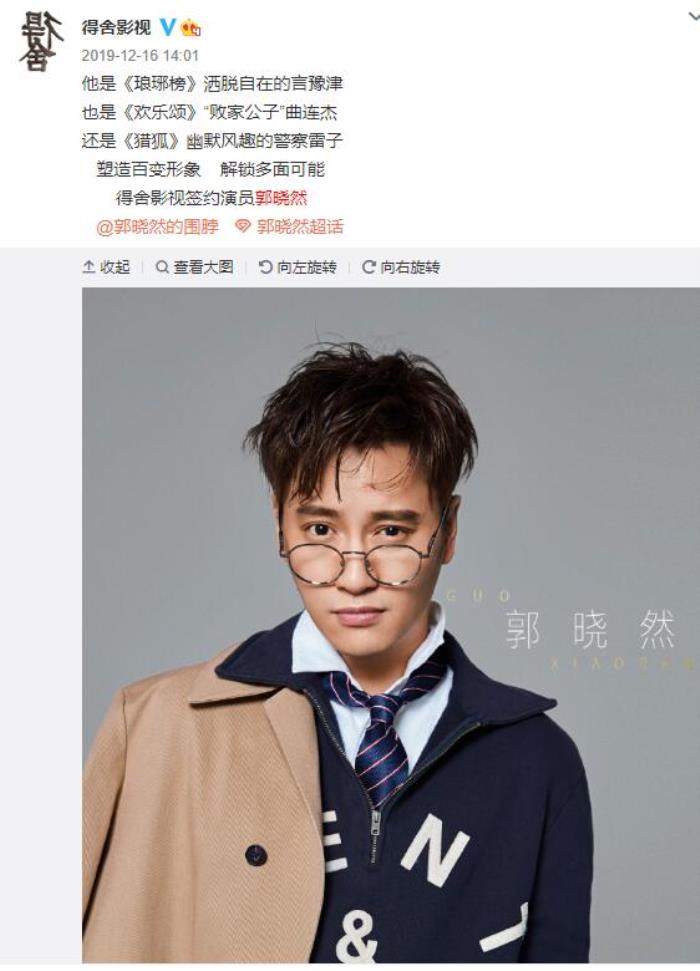 郭晓然虽然人气不及老板王凯,但这几年作品也不少,在《琅琊榜》里饰演言侯爷的儿子言豫津,在《欢乐颂》里饰演曲筱绡同父异母的败家哥哥曲连杰,在《猎狐》里饰演刑侦警察张小雷等等。