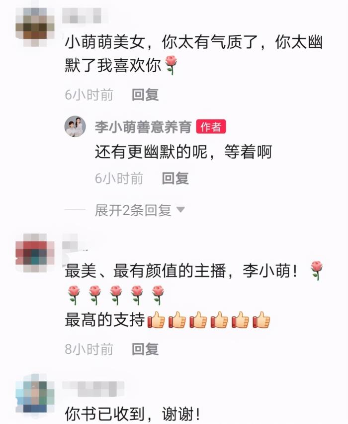 很多网友看到李小萌的视频后评论道“漂亮的,小萌美女太有气质了,你太幽默了,我喜欢你”,李小萌也回应道“还有更幽默的”,也有网友留言称“最美最高颜值的主播李小萌,你写的书已经收到,谢谢”。