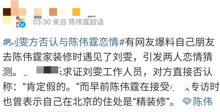 之前曾传出与超模刘雯的绯闻,对此事,某娱乐大V向刘雯方求证时得到否认。而陈伟霆也用先前房子"精装修"采访打脸网友,快速破除谣言。
