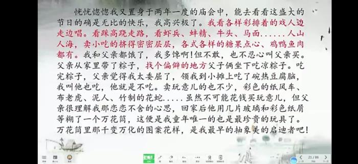 师:孩子们,是啊,父亲带我去偏僻的地方吃凉粽子就是对我的保护、关心,更是呵护。读到这个细节,再想一想庙会上的热闹。我们就体会到了父亲对我自尊心的呵护。