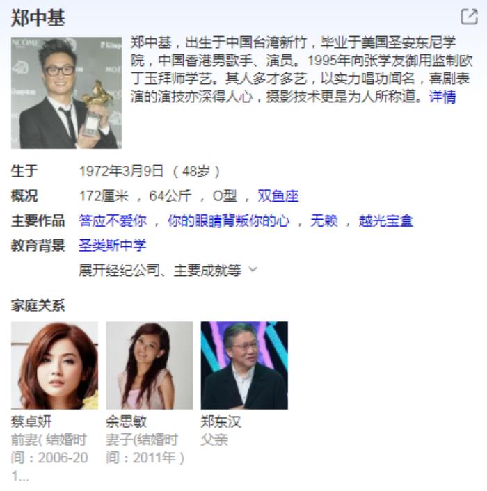 在郑中基的人物关系上可以看到他和蔡卓妍是离婚夫妻的关系,和余思敏是现任夫妻的关系。
