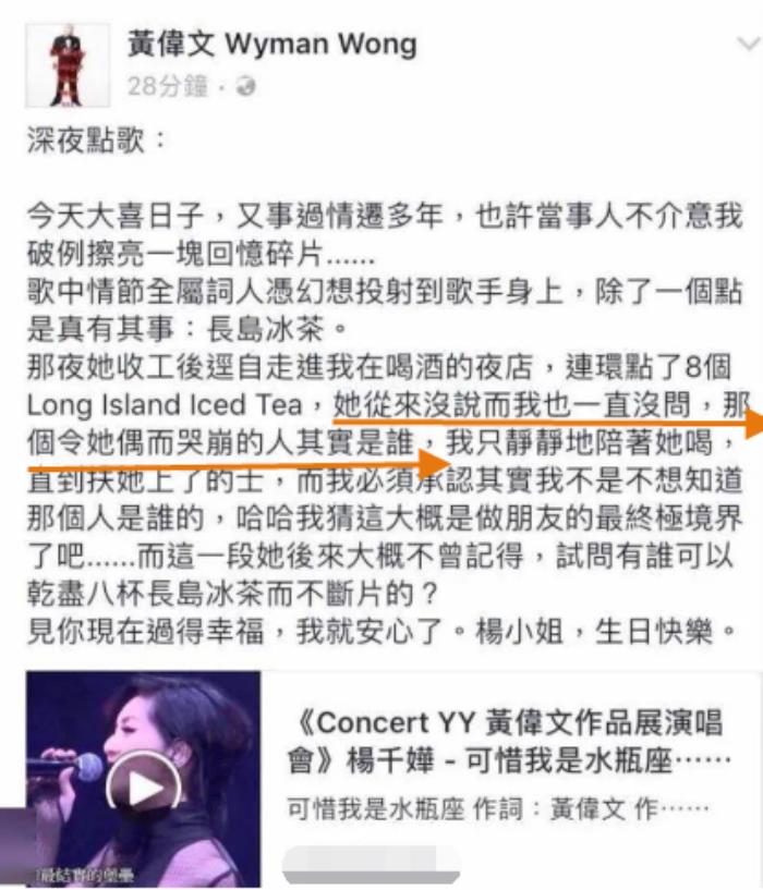 其实他们之间是真的有用力地爱过对方,杨千嬅有一首歌《可惜我是水瓶座》,这首歌的创作背景是杨千嬅正值伤心的时候,约了黄伟文出来喝酒,点了8个长岛冰茶。
