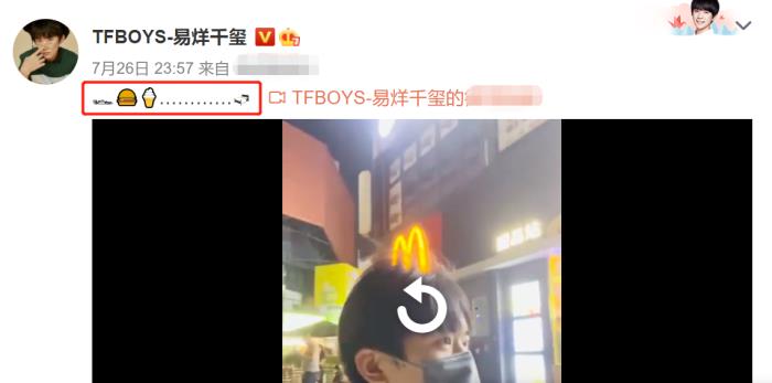 易烊千玺在文案中发了几个可爱小表情,一个汉堡一个冰激凌,最后还有一张床。大概意思就是今天开玩具车上街吃了汉堡薯条非常开心,吃完美食后就可以回家美美地睡一觉,真的很接地气。