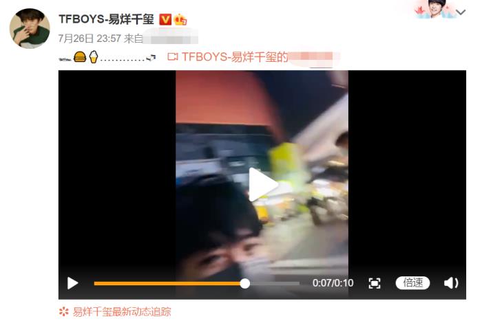 7月26日凌晨,易烊千玺在个人社交平台上发布了一段开玩具车上街视频。