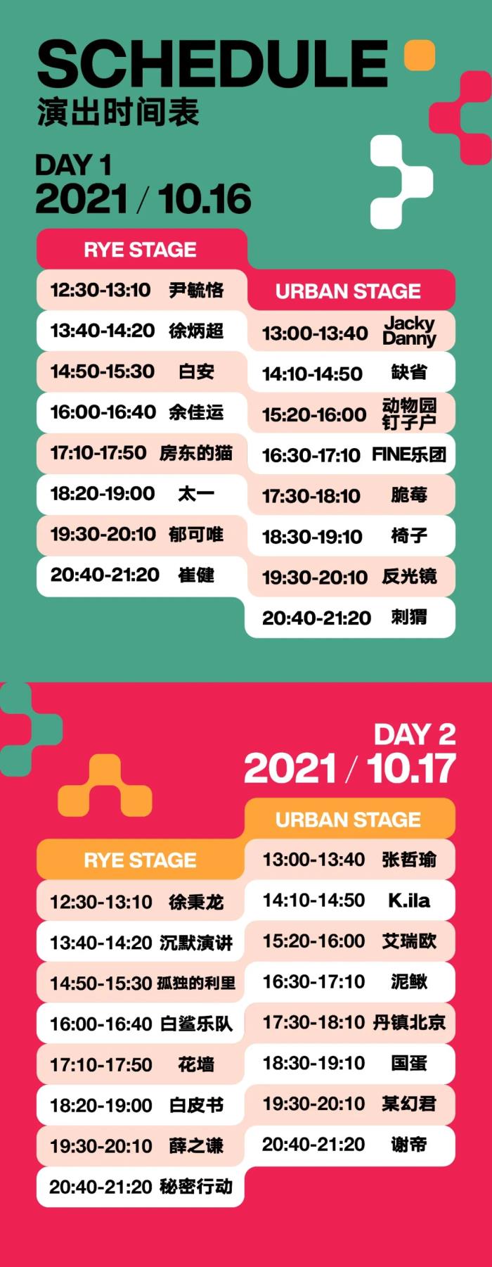 10月16日,RYE舞台包括:崔健,吉他手,小号手,歌手和作曲家,因其在中国歌坛的特殊地位,被视为中国的文化图标,他整整影响了一代人;用歌声讲述动人故事,获封“情歌歌后”的美誉的内地实力女歌手郁可唯;曾参加《我们的歌》《为歌而赞》和《即刻电音》等节目的“原力计划年度音乐人奖”获得者太一;在音乐舞台上闪闪发光,由吉他手吴佩岭和主唱王心怡组成的唱作二人组房东的猫;以淳厚舒适的R&B曲风收获广大音乐爱好者认同,被视作新生代R&B唱作代表的唱作人余佳运;创作风格清新空灵,具有极高个人辨识度的中国台湾流行乐女歌手、词曲创作人白安;中国内地流行男歌手、演员徐炳超;被业内评价“空灵声线特质、上乘唱功水准可遇不可求”的新声代华语乐坛唱作人尹毓恪。URBAN舞台包括:简单的旋律,真诚的歌词,配上独一无二的双声部男女主唱的摇滚乐队刺猬;1997年组建至今的中国著名老牌朋克乐队先声反光镜乐队;2019年荣获第三十届⾦曲奖“最佳演唱组合”奖项的椅子乐团;流畅的旋律,细腻的歌词配以严谨又极富现场感的编曲,迅速成为年轻摇滚乐队中一股无法忽视的力量的脆莓;唱腔和风格具有独特高辨识度的内地流行独立音乐人组合Fine乐团;17夏天成立,隔年凭借同名专辑斩获阿比鹿年度最佳新人,2020年以单曲《藏在你的房间》登顶itunes榜单前3的动物园钉子户;以自赏为基底出发,探索旋律与音色的异色编织,伴随成长,思绪越发沉淀,音乐风格也越发成熟的缺省;以及凭借极具时代画面感的声音与表演风格,迅速成为了西洋传统摇滚乐在国内新一代突出代表的Jacky Danny。