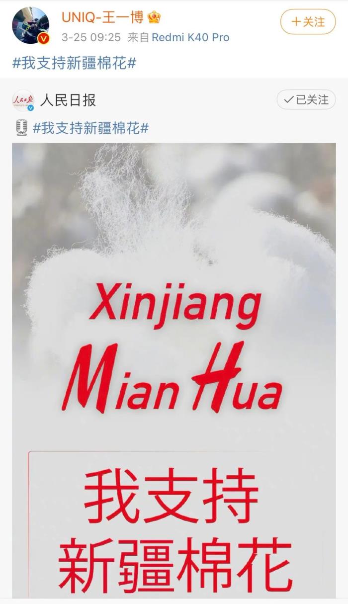 随后,王一博本人在微博上发声表明态度:支持新疆棉花。