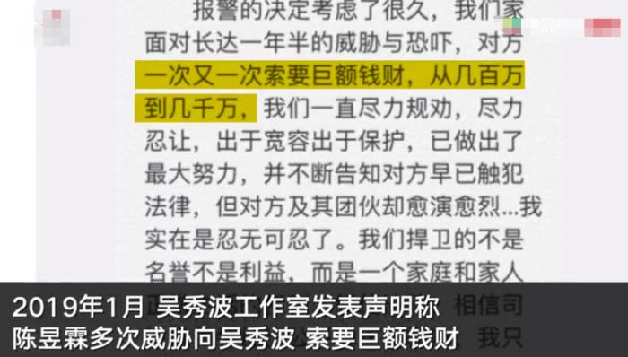 近日,陈昱霖涉嫌敲诈吴秀波案宣判引发关注。2月19日,接近司法系统的知情人士向新京报记者证实,陈昱霖(真名陈梦琳)因敲诈勒索被判处有期徒刑三年,缓刑三年。2019年,吴秀波工作室发声明称吴秀波多次被陈昱霖威胁,并索要巨额钱财。2021年1月,北京朝阳区人民法院审理此案。19日,陈昱霖方代理律师发表声明证实陈昱霖已《认罪认罚具结书》,目前已离开看守所,不提起上诉。