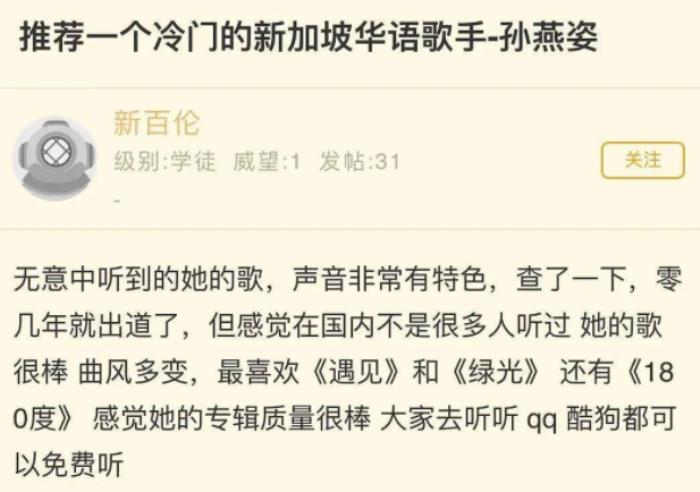 曾经有人在网络上说孙燕姿是冷门歌手,那可真是笑掉大牙了,对于很多8090后的人来说,孙燕姿的歌那是陪伴了童年和青春时期啊。