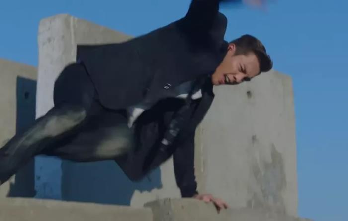 刚跳完车,陈伟霆又好像没事人一样走向大反派,用枪指着他。此时陈伟霆不仅神采奕奕,脸也干净无瑕,帅得都让人忘记了他已经经历了中弹、撞车、打斗、跳车等一系列危险行为。导演,你拍的是动作片还是科幻片啊?