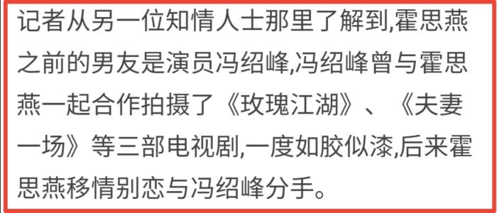 和霍思燕接连合作过《夫妻一场》,《玫瑰江湖》等三部电视剧的冯绍峰,就被知情人爆料,是霍思燕的男朋友。