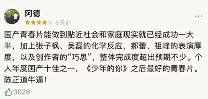 有影评人这样评价:这是一部最像青春的青春片,一部把孩子拍得像孩子的青春片。回顾华语影坛,过去的青春片往往和出轨、堕胎等狗血剧情联系在一起。