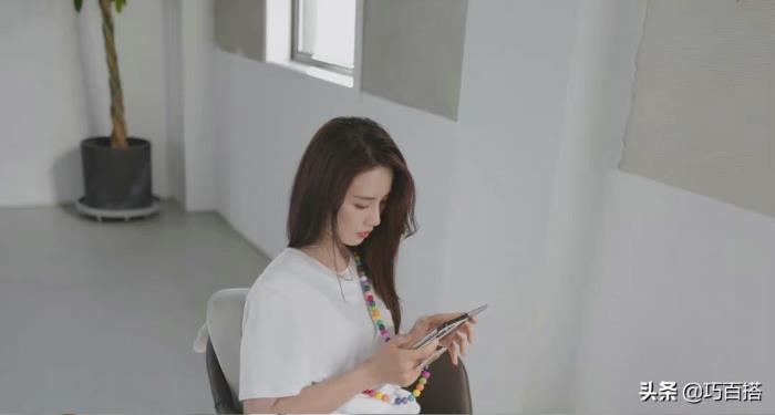 虽然造型非常简单干净,但是在t恤衫之外还有撞色设计的小心机。圆珠因为七彩的配色显得格外出挑,虽然只是一个手机装饰,但是在整幅画面中无疑起到了点睛的效果,丰富了整个画面的时尚感。