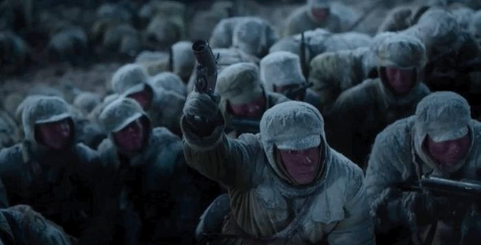 导演俯拍的大全景镜头,配之以一望无际的纯白雪山,仿佛自己置身于这零下40度的冰雪战场,但影片又带来了一种全知视角,有一个航拍镜头,黑夜中至少十几平方公里的战场都被密集的爆炸和火光点亮,黑夜宛若白昼。