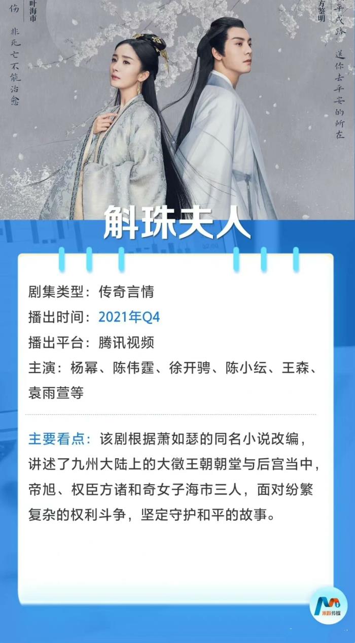 有很多顶级流量主演的电视剧或许会在第四季度播出,比如杨幂和陈伟霆主演的《斛珠夫人》,这是“九州”系列电视剧。杨幂很久没有古装剧播出了,上一次还是2018年的《扶摇》,所以很新鲜。