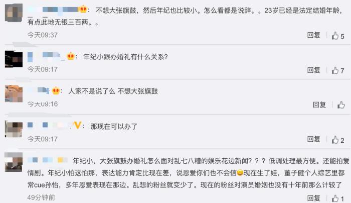网友们对此意见不一,有人觉得孙怡的说法像说辞,“年纪小跟办婚礼有什么关系?”不过也有人赞同孙怡的说法,觉得可能她和董子健就是不想大办而已。