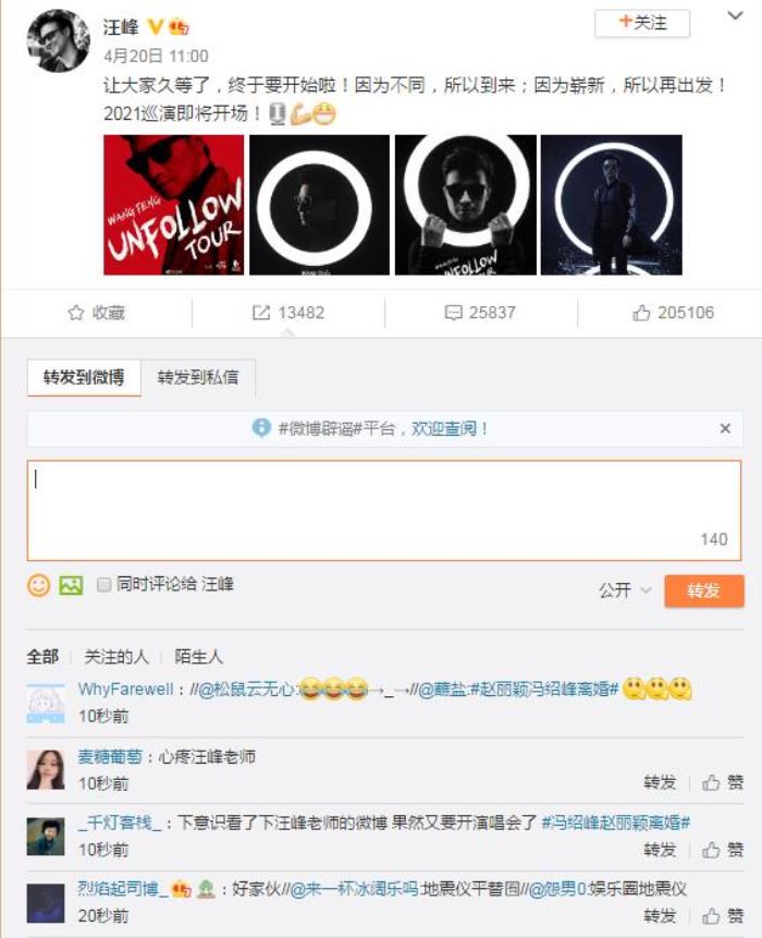 此外,与此话题相关的热搜#汪峰定律#又来了。赵丽颖冯绍峰官宣离婚,不少网友表示:下意识看了下汪峰老师的微博,果然要开演唱会了!
