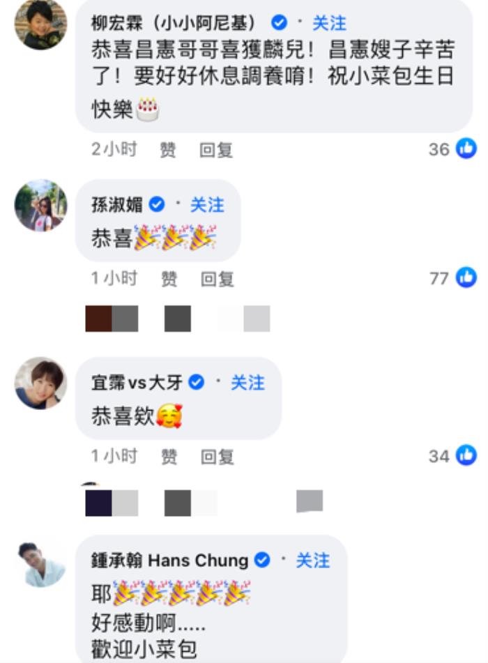 喜讯传出后,蔡昌宪的好友林佑星、黃小柔、楊小黎等人,也纷纷在评论里送上了祝福。