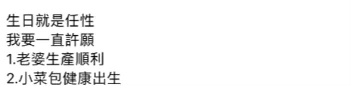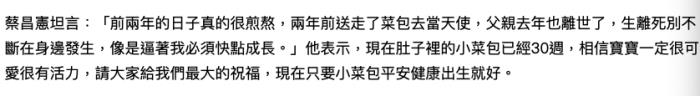 蔡昌宪生日时,曾许愿妻子能生产顺利,小菜包健健康康出生,所有人都平平安安,这次他终于得偿所愿了。