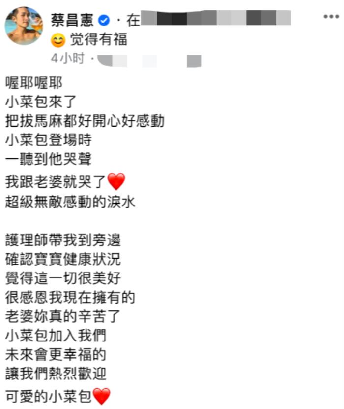 蔡昌宪本人激动到发文,称一听到孩子的哭声,他和妻子也都忍不住流下了眼泪。