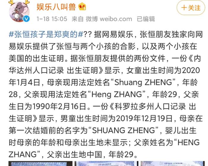 1月18日,娱乐圈猝不及防迎来一个大瓜。郑爽前男友突然发文否认骗财,随后晒出一张跟一对双胞胎孩子的合影,引发热议。