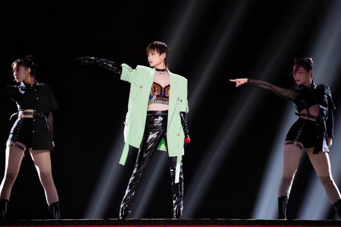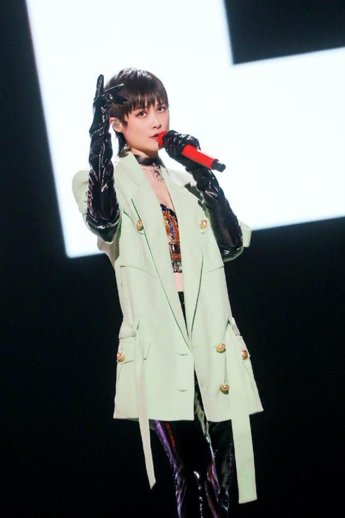 李宇春虽然适合这种夸张的颜色,但是下装也搭配了基础黑色,这样才不会显得太花哨。而且黑色的高级感比较强,气质也较为沉稳大方,穿在身材高挑的李宇春身上更显大气庄重。