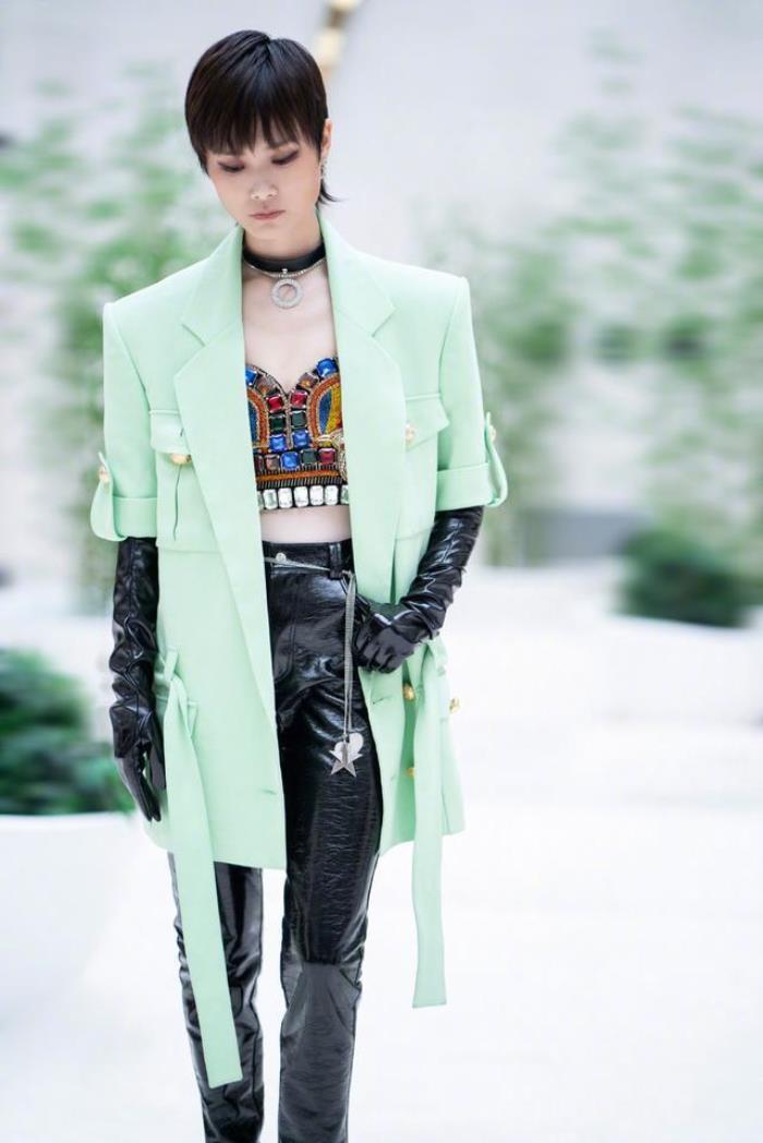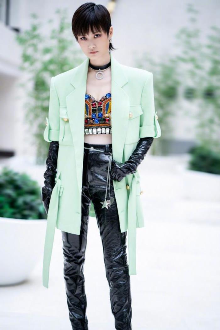 西装外套是一件经典时尚单品,但是也比较难穿出特色。而李宇春穿着的是一件浅蓝色的西装外套,而且剪裁样式也别具一格,袖口位置和腰带设计个性十足,穿在身上自然能引人注目。