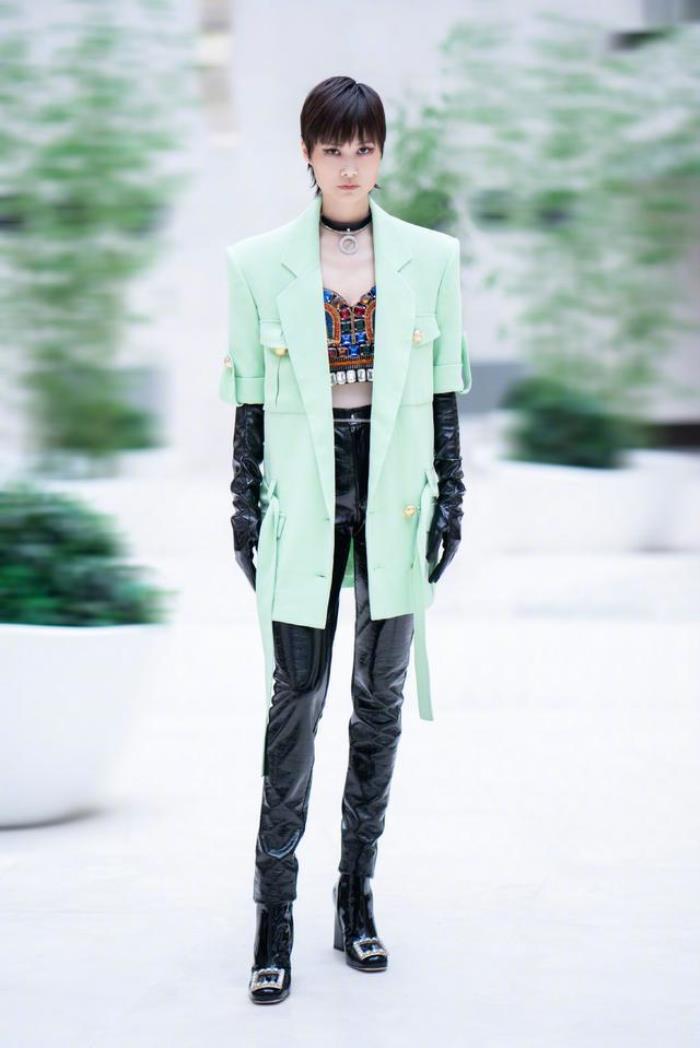 李宇春没有像普通人那样选T恤或者衬衫搭配西装外套,而是内搭了一件带有彩色贴片的背心,带有满满的异域感。下半身搭配了同色调高腰皮裤和高跟皮靴,下半身的视觉长度十分优越。