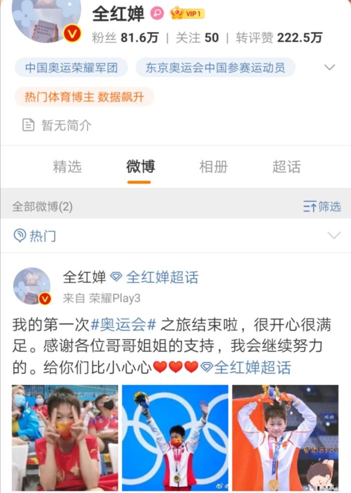 8月9日,全红婵在自己的微博发布第一条动态,就涨粉80万,她的那条动态获得了222万的转评赞,成为了热门体育博主!