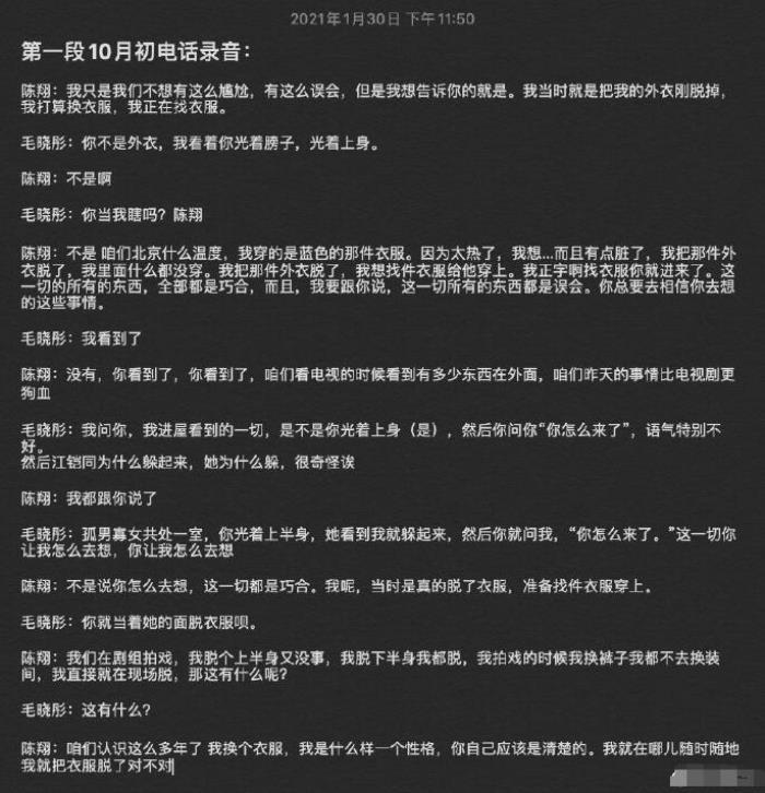 1月30日,陈翔发文称,自己并没有出轨,早在出轨事件发生前,他就已经和毛晓彤和平分手了。并且还拿出了所谓的有力证据,还列出时间线力证自己的清白,最后还暗戳戳的内涵前女友毛晓彤。