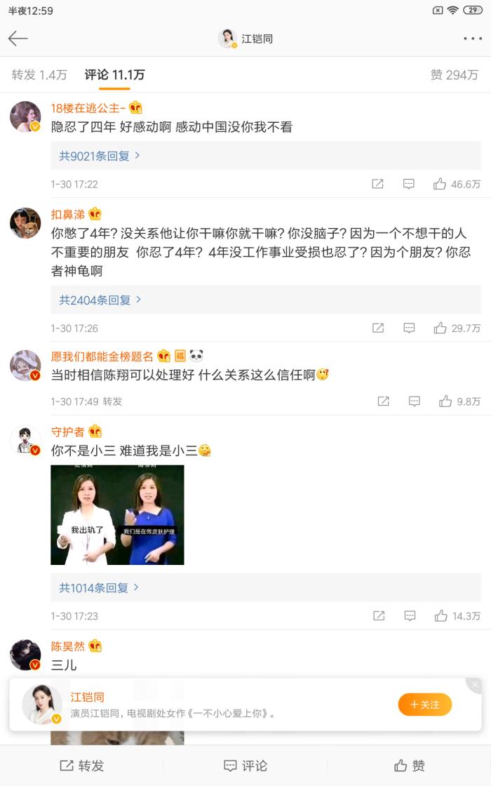 女方江铠同也是和陈翔共处同一战线,发长文,说自己一直为这件事背黑锅,甚至她还遭受网络暴力。