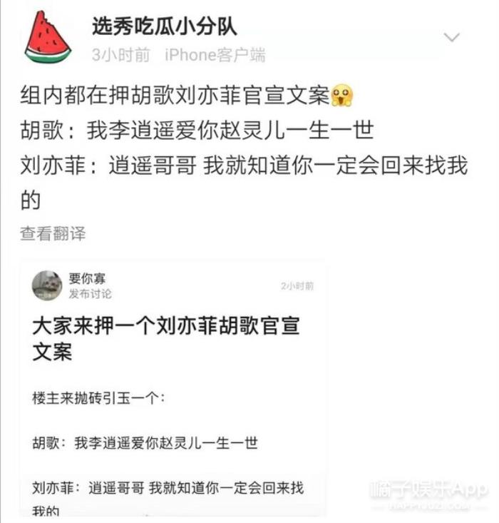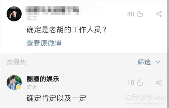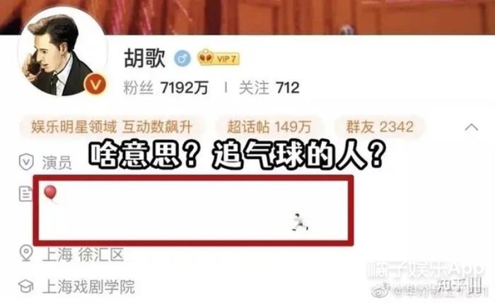 2.胡歌的微博个签里有气球,气球表示易飞,套公式易飞=亦菲。