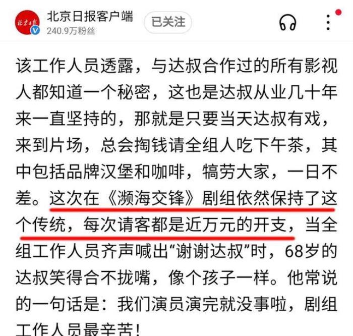 有关人员还表示达叔的为人比较豁达十分亲和,如果当天有达叔的戏份,达叔都会自掏腰包请所有的工作人员吃饭,每次请客的开支都将近万元之多,对此达叔表示演员演完就没事了,而现场的工作人员还要负责善后的工作,更是辛苦!年近七旬的达叔是那么的热爱工作,是那么的善良!