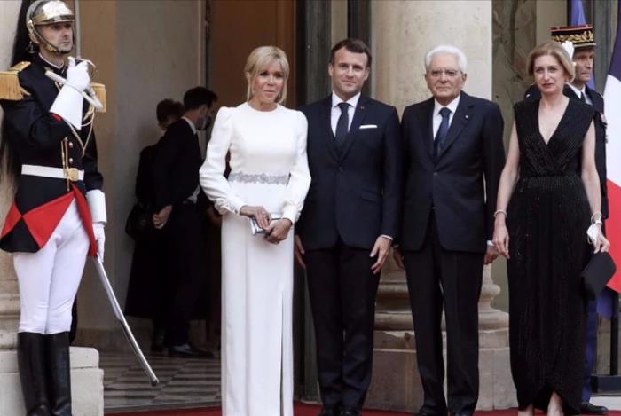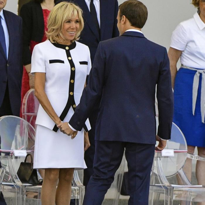 想要保持优雅得体,尽量要少尝试花哨的混搭,借鉴基础的套装搭配就很不错,套装的穿搭省时省力,统一的穿搭风格也能够避免出错,比如下面的白色套装穿在法国第一夫人身上依然很美,剪裁利落,自然也可以修饰身材啦。