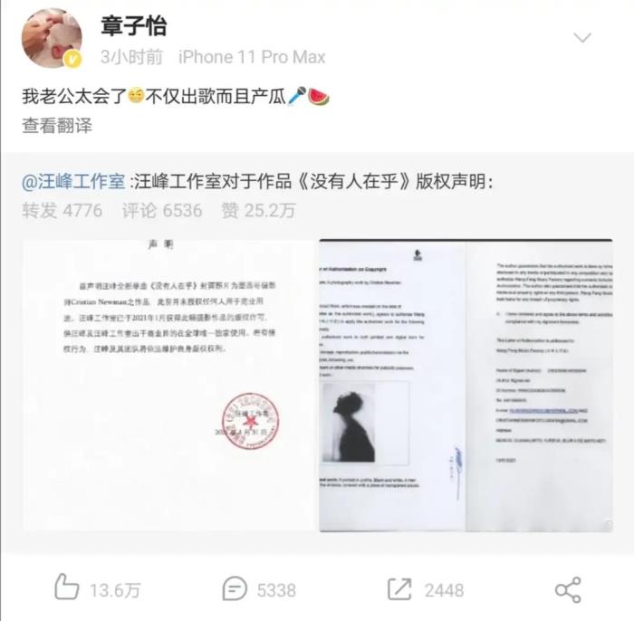 之后,老婆章子怡力挺老公汪峰新歌并回复:“我老公太会了,不仅出歌而且产瓜!”