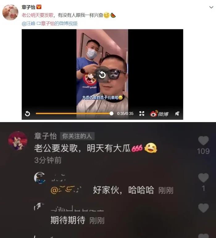 汪峰老婆章子怡很兴奋,准备在线吃瓜呢:“老公明天要发歌,有没有人跟我一样兴奋。”表情奸笑,吃瓜模样~“老公要发歌,明天有大瓜!”