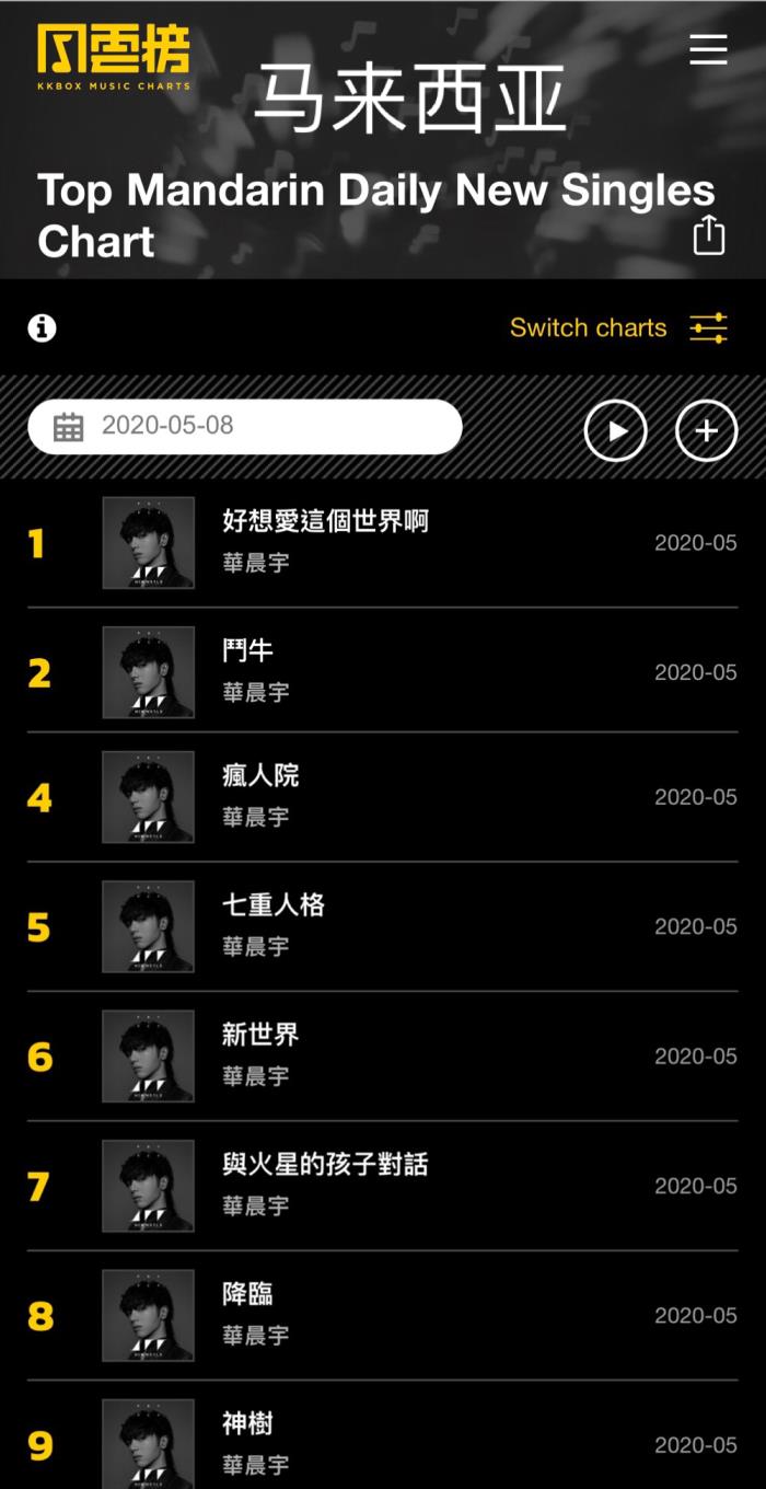 2020年5月4日,华晨宇全新创作专辑《新世界》海外iTunes上线首日,在没有任何海外活动与宣传的情况下,空降15个国家及地区,拿下五个国家及地区榜榜首。上榜后在iTunes专辑排行榜马来西亚/新加坡/越南/中国澳门/中国香港/中国台湾这6个国家及地区已经连续TOP1!
