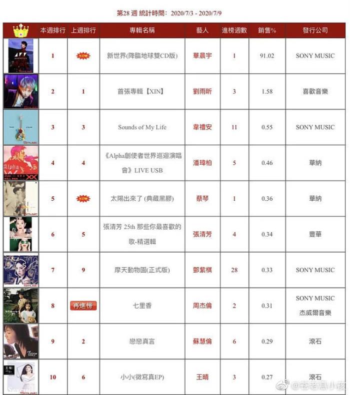 2020年7月10日,五大金榜周榜更新,华晨宇全新专辑《新世界NEWWORLD》降临地球双CD版在五大金榜首周销量以91.02的超高百分比空降五大金榜2020年第28周第一名!破五大金榜记录!